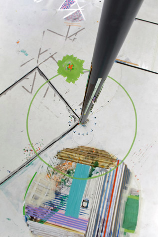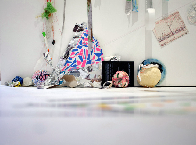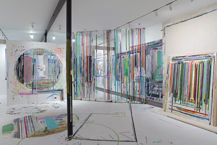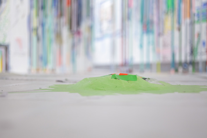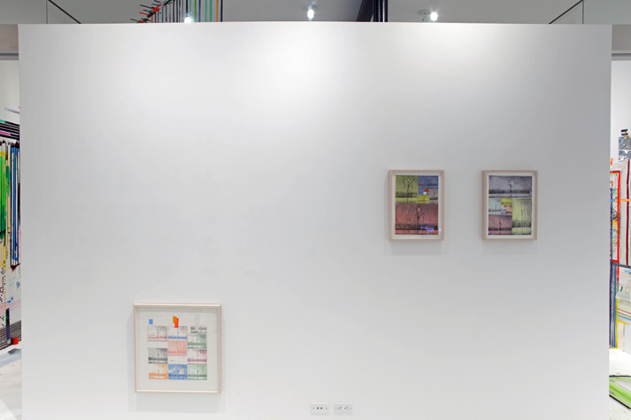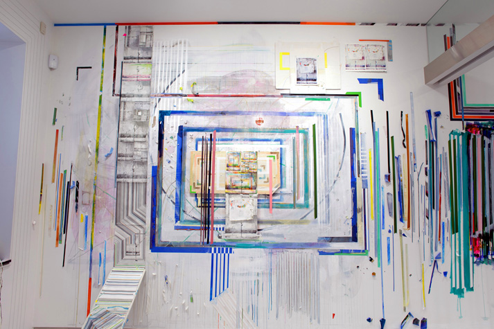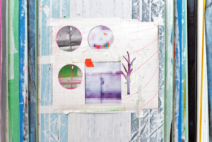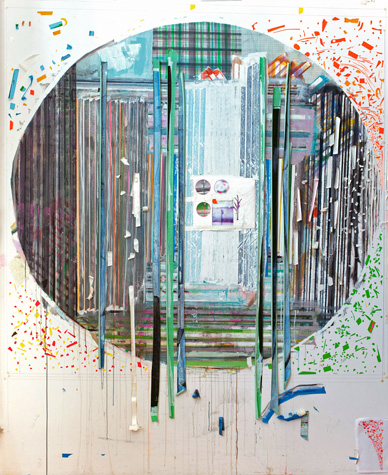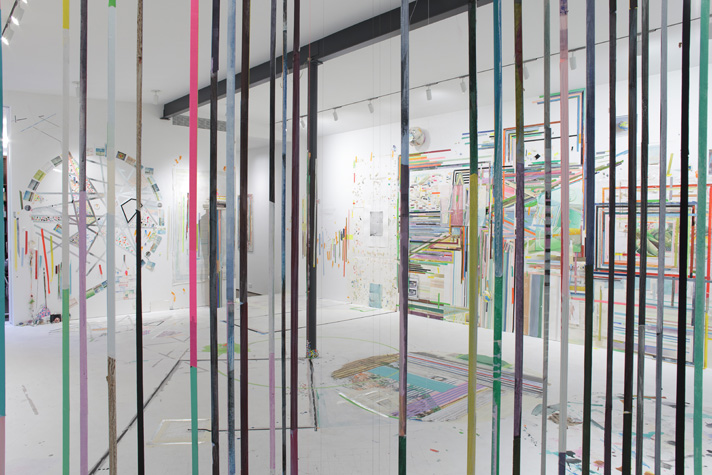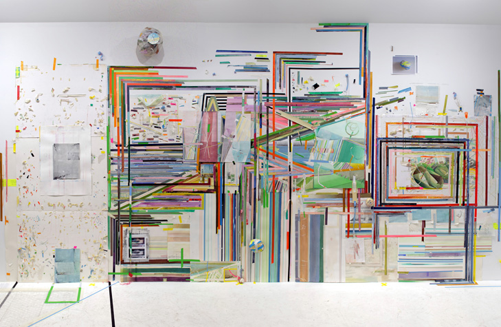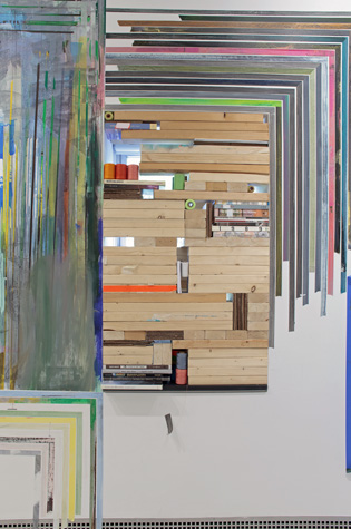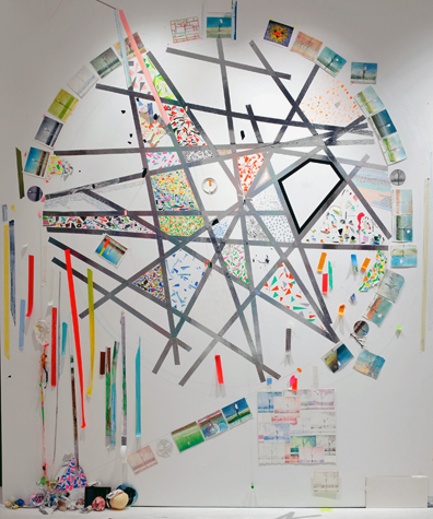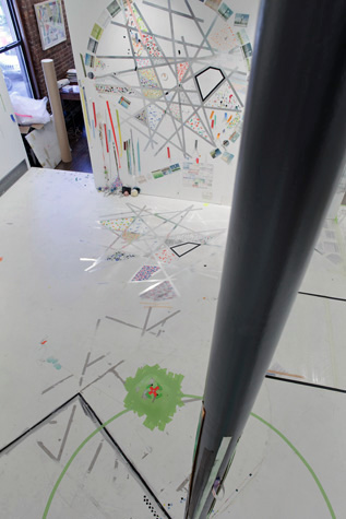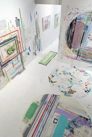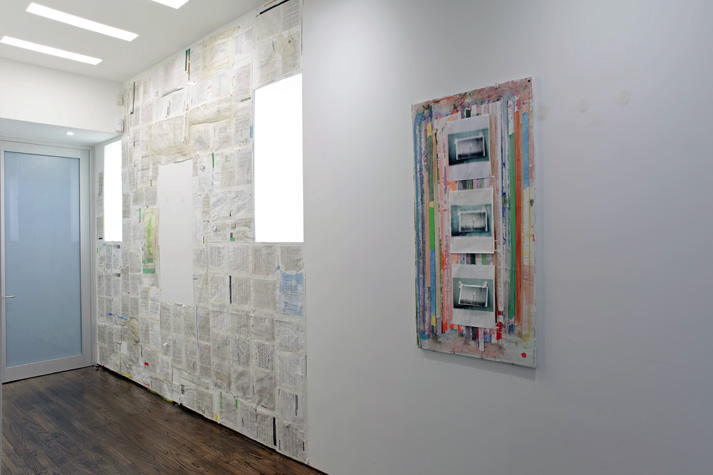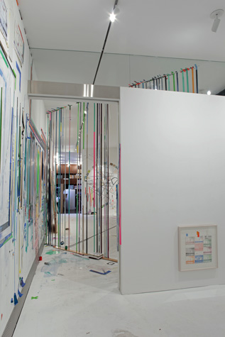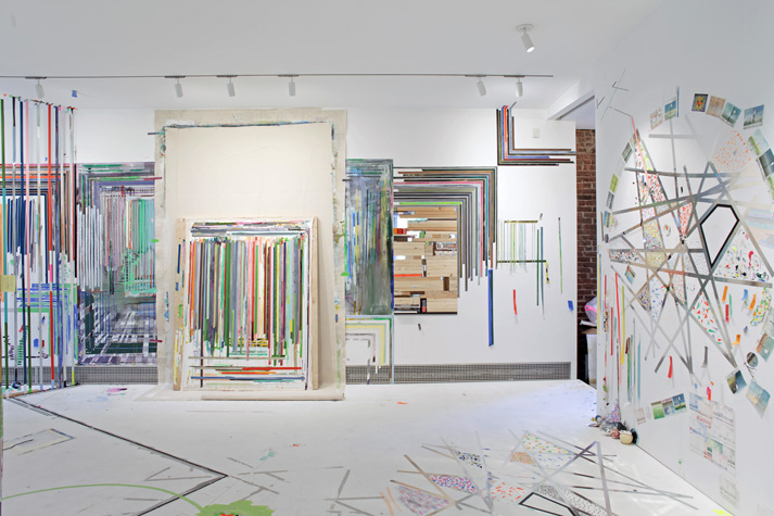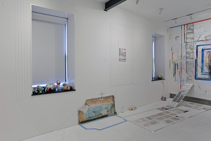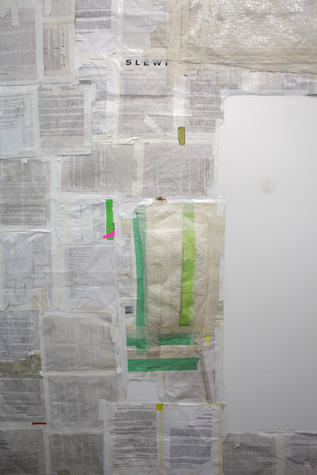 | 2008/2009 < 2009/2010 - 1,000 sq ft, mixed media installation (solo exhibition), at Sue Scott Gallery (New York, 2009) Mixed media process-based painting installation. The work was developed over one year while in residence at the Marie Walsh Sharpe Art Foundation Space Program (2008/2009). Process was repeated at the gallery during the one month installation period. The past of 2008/2009 was accelerated into a month and exhibited at the start of the 2009/2010 art season. The materials included paint, tape, canvas, paper, watercolor, acrylic, wallboard, bubble wrap, art books, and exhibition press releases. The question considered to start the studio exploration was: what might happen if the system-based work of Frank Stella (1959 Black Paintings) was explored alongside Casper David Friedrich’s “parallel band application of discrete hues” (from my 2003 memory of seeing Friedrich’s work in Berlin, in particular, Solitary Tree, 1821)? The inevitable image of an isolated leafless tree on a flat ground was repeated in different forms throughout the installation. James Kalm video 2009 Lower East Side Kick off, 2009/2010 shown at (1:03 - 3:07) Rebecca Wolff reads from The King within Franklin Evans' lookbackstage, 2008/2008 < 2009/2010 Link to Roberta Smith Review, New York Times, September 2009. Link to Lyra Kilston, Review, Art in America, November 2009. |