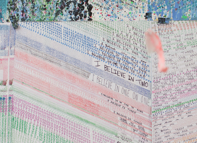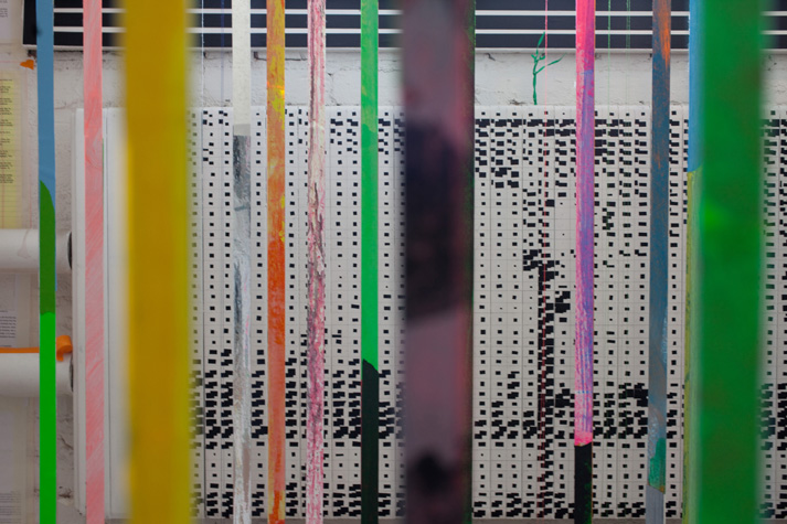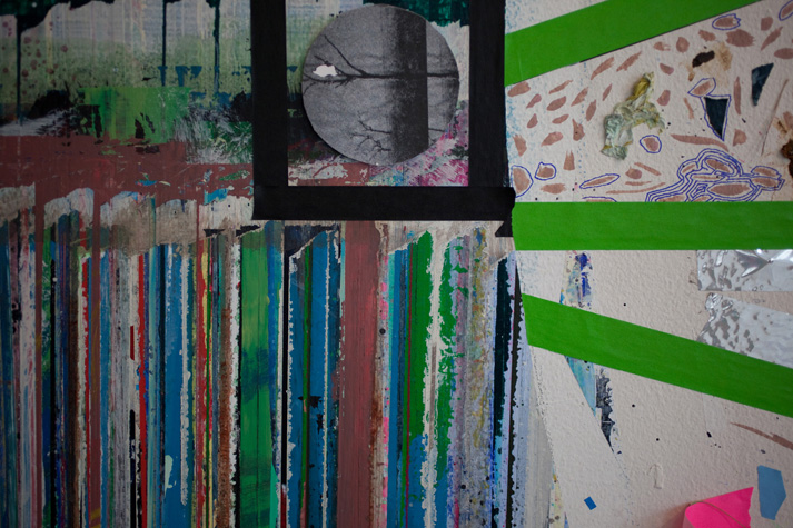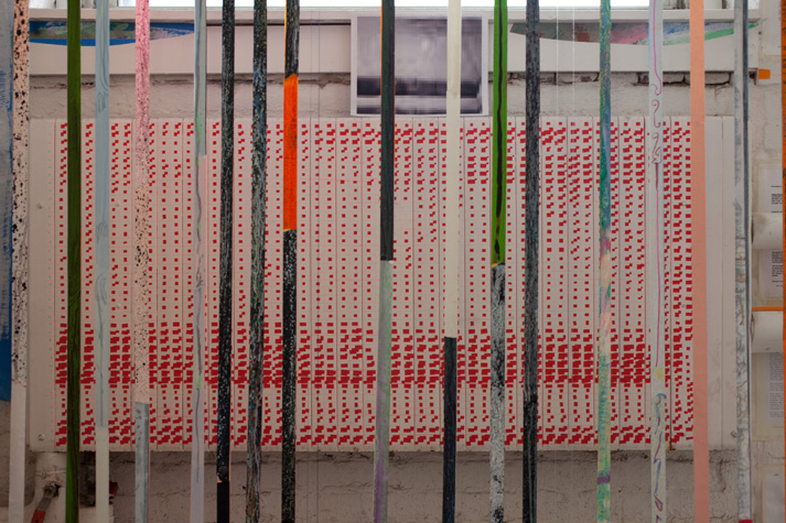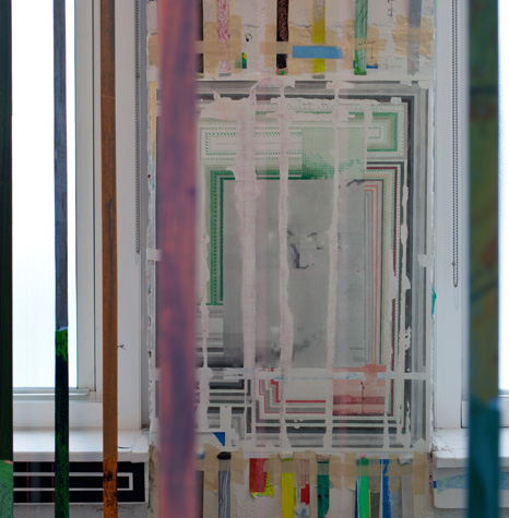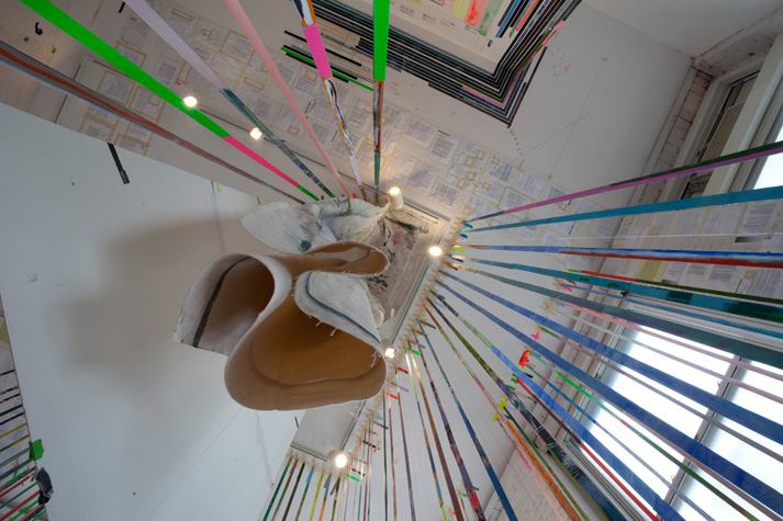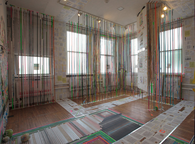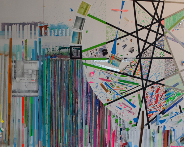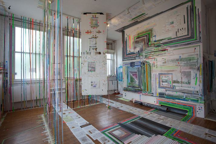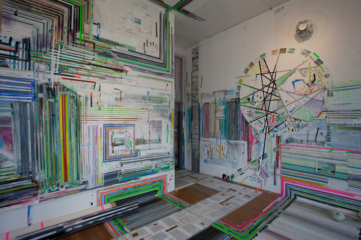 | timecompressionmachine 500 sq ft, mixed media installation, at MoMA PS1 for Greater New York 2010, curated by Klaus Biesenbach, Connie Butler and Neville Wakefield timecompressionmachine is a mixed media process-oriented painting installation which explodes painting’s flatness into three-dimensional space. The experiential installation consists of acrylic on wall, acrylic on tape strung as tape screens, acrylic on canvas, watercolor on paper, digital prints, text, books, laminated printed images, exhibition press releases, and collaged text from exhibition reviews. The exhibition space and the “studio” merge. The material and ideational processes compress a measurement of past time (e.g., accumulated press releases from gallery exhibitions for one art season) into the space of a room. MoMA PS1 video Greater New York 2010 Franklin Evans: Paint and Process MoMA PS1 link Greater New York 2010 Link to Jerry Saltz Review, New York Magazine, May 2010. Link to Roberta Smith Review, New York Times, May 2010. Link to Colby Chamberlain Review, Art Agenda, June 2010. Link to Richard Goldstein Roundtable, Bomblog, September 2010. Link to Faye Hirsch, Review, Art in America, September 2010. |