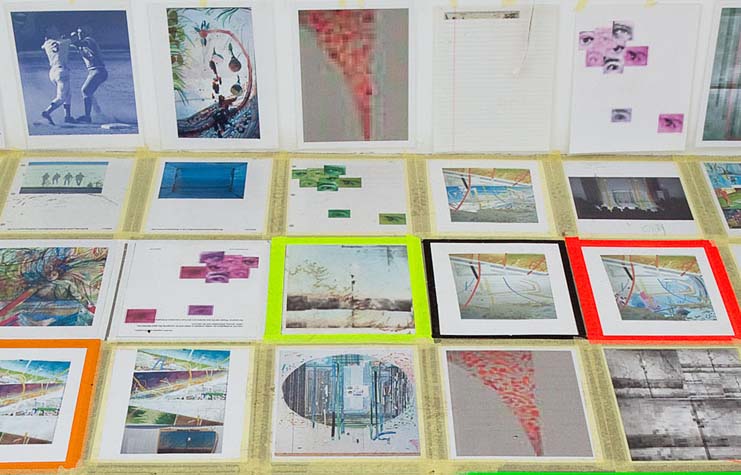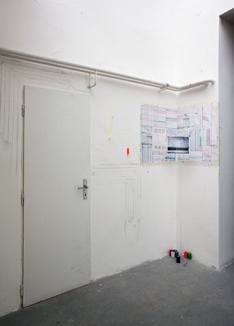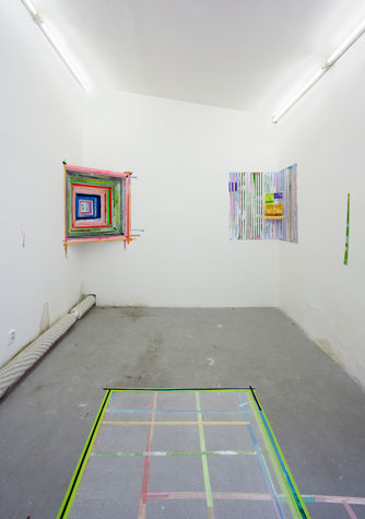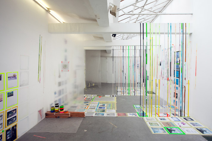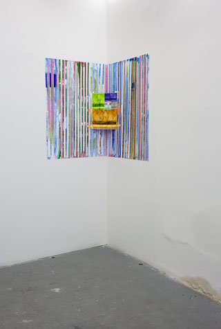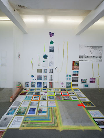 | floornotesandcornerpositions, group exhibition NY/Prague 6 at Futura Center for Contemporary Art, curated by Omar Lopez-Chahoud, 2010, Prague, Czech Republic Six artists were invited to create projects over the course of three weeks while in residence at Chateau Trebesice. Futura presented the completed work. Evans project floornotesandcornerpositions was a re-enactment of his working processes within the diverse architecture of the exhibition space. Floornotes was an assembly of studio images over time (roughly the past five years), each at 8.5 x 11 print and laminated. The piece, presented on the floor and up the walls, was both an index and survey exhibition of the artist’s thoughts. Cornerpositions used the four available corners in the installation space to address the anxiety related to “painting oneself into a corner.” |