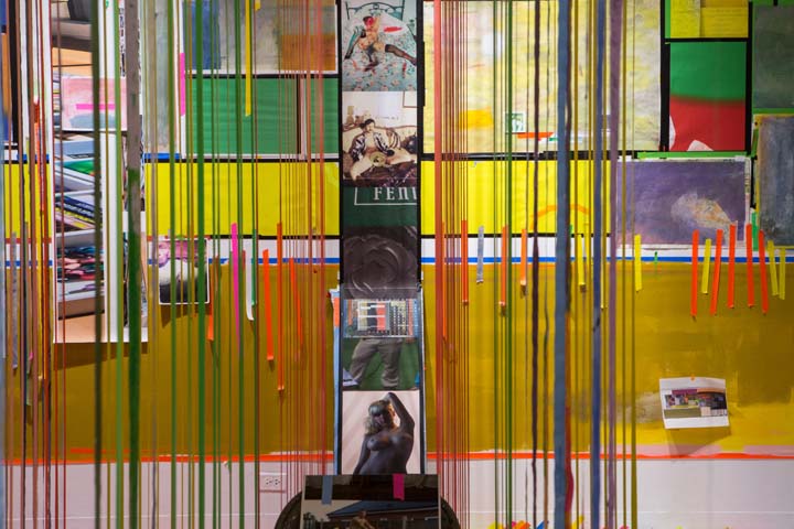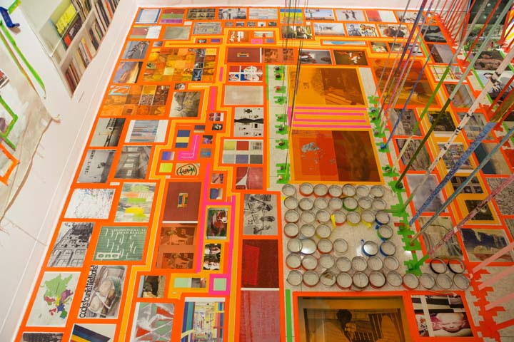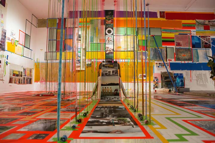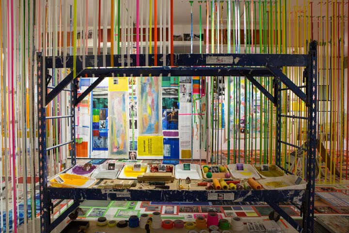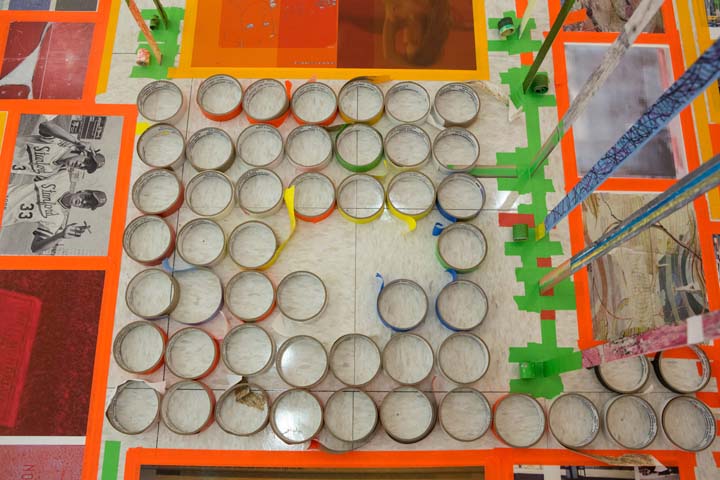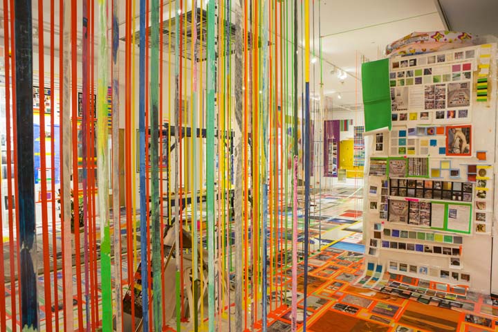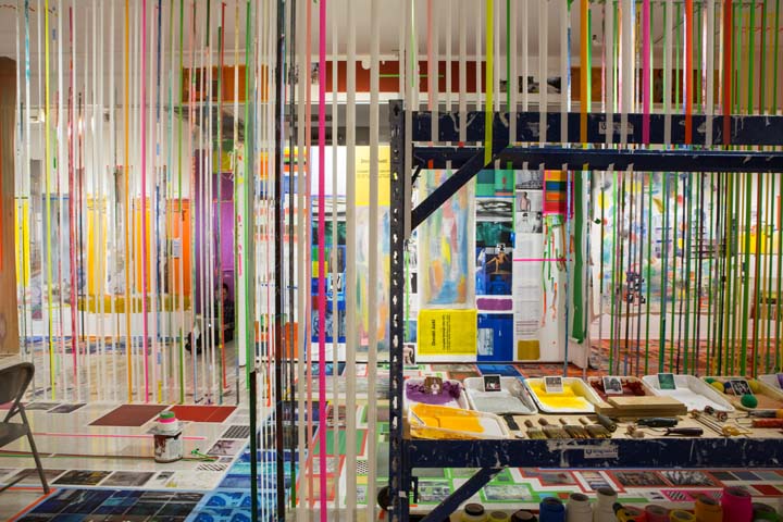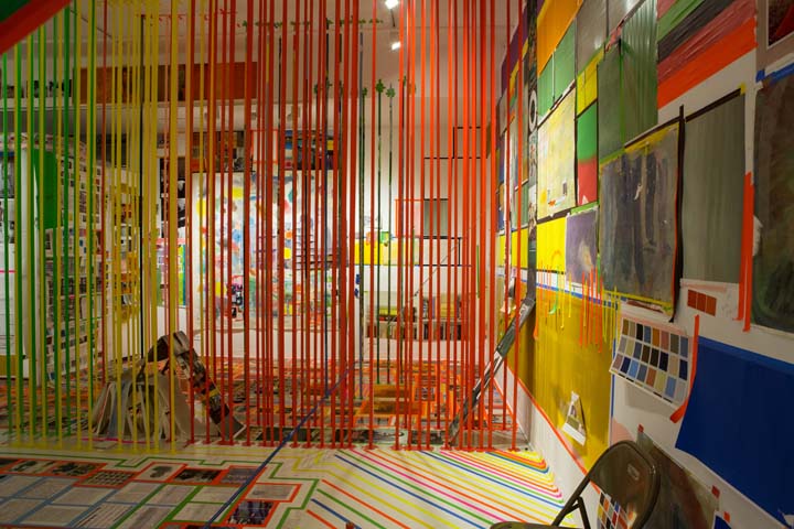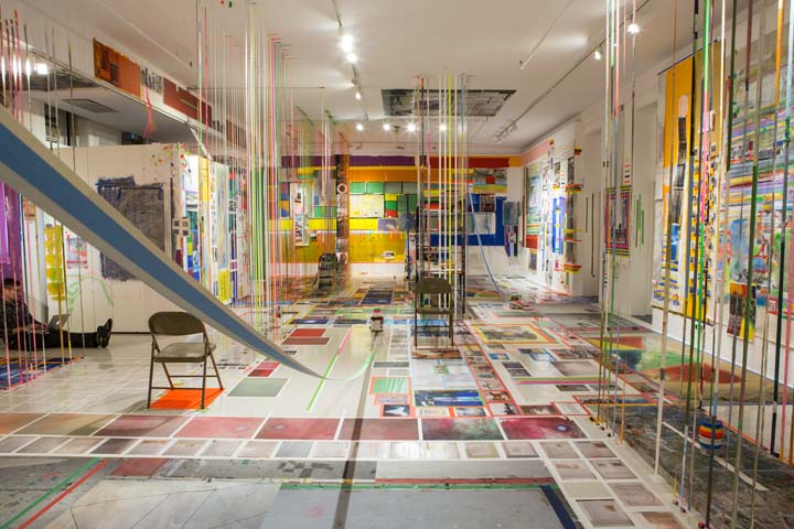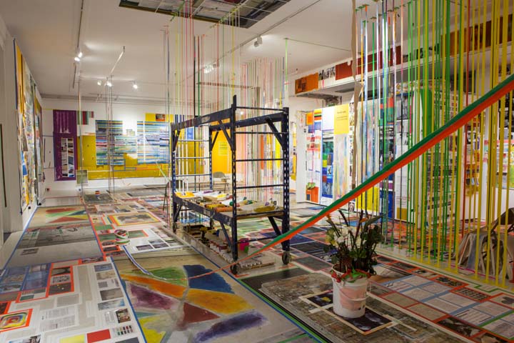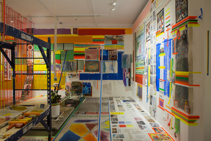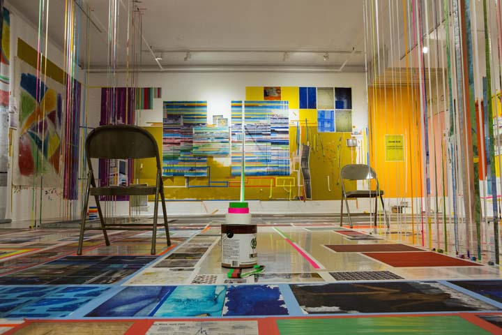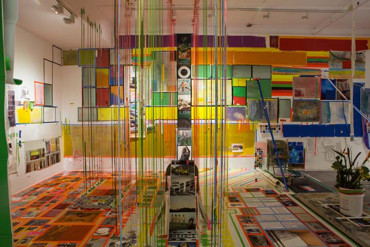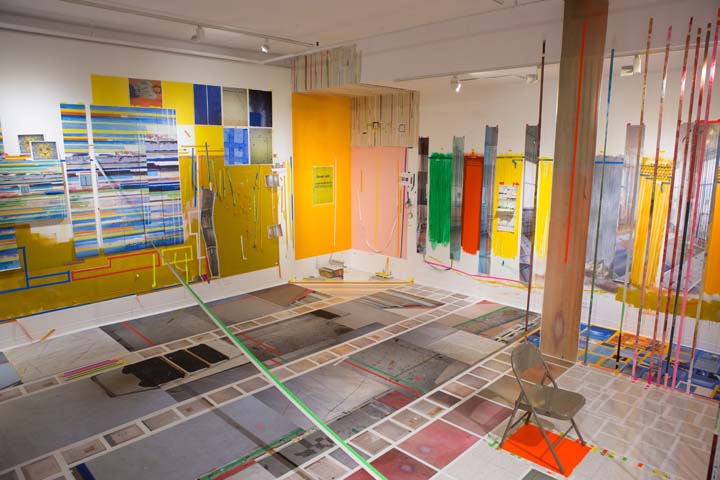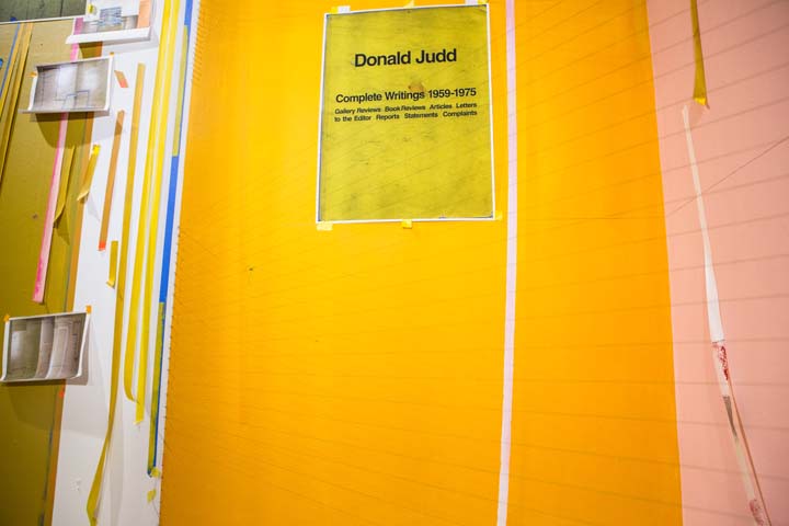 | juddrules - 1,500 sq ft, mixed media installation (solo exhibition), at Montserrat College of Art(Beverly, MA, 2014) PRESS RELEASE: Montserrat College of Art is proud to present juddrules featuring New York-based artist Franklin Evans. While Evans considers himself first and foremost a painter his works are process-based physical environments, surrounded by the very source materials that conceptually inform his paintings. "It's like walking into a painting," describes Evans, anticipating how Montserrat Gallery will evolve into a 'landscape' of ephemeral and factual materials over the course of his three week residency. At first glance the space resembles a studio more than a gallery: long strands of painters tape, unstretched canvas mounted to the walls, books, low resolution printed out photos and stacks of paper implies that the audience is literally "stepping into" a work in progress. Evans utilizes the gallery as a site of production, rather than an endpoint in which show a "finished" product. By revealing cultural references influential to his work such as theoretical texts, art historical documents, exhibition press releases, digital images, etc., Evans creates a web of interconnected ideas. Leonie Bradbury, Director and Chief Curator of Montserrat Galleries describes the artist's work as a network. "The artwork exists in a state of flux, continuously transitioning, wavering between assembled and dismantled, reconnecting and disconnecting, configuring and reconfiguring to form moments of coalelesence." The inclusion of both found objects (tape, photos, books) and his fine art paintings work together to illustrate an expansive view into Evans' history and biography as an artist. The flux between big picture thematics and personal items within the installation creates a constant loop of informing and influence. Another way that Evans communicates sources of influence and inspiration is through the titles of his work. For example, paintingassupermodel, a recent solo-exhibition at Ameringer McEnery Yohe Gallery (New York) expanded upon three essays in Yves-Alain Bois' book, Painting as Model. For his exhibition at Montserrat, Evans will work with the writings of Minimalist artist, Donald Judd, specifically those that were highlighted or underlined during Evans' original reading of the text. Creating self-imposed guidelines or "rules" for which excepts to incorporate into the installation results in the title, juddrules. Link to juddrules catalogue, Text by Leonie Bradbury, Robert Moeller, Patrick Neal , 2015. Link to Boston Globe review, Cate McQuaid , November 2014. Link to Art New England review, Robert Moeller , October 2014. |