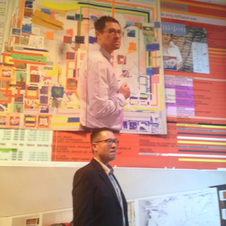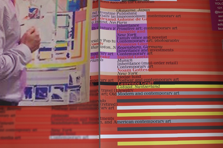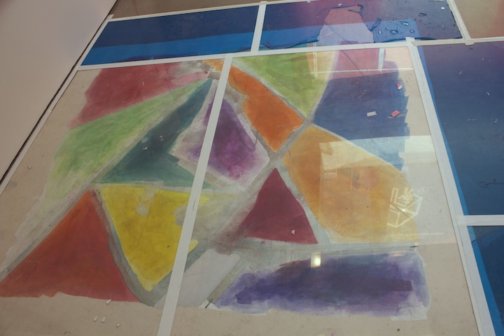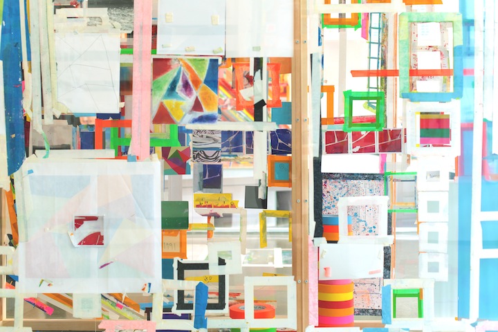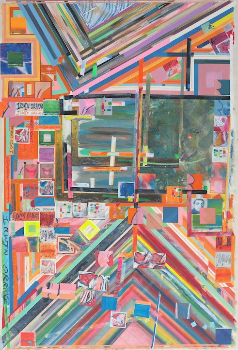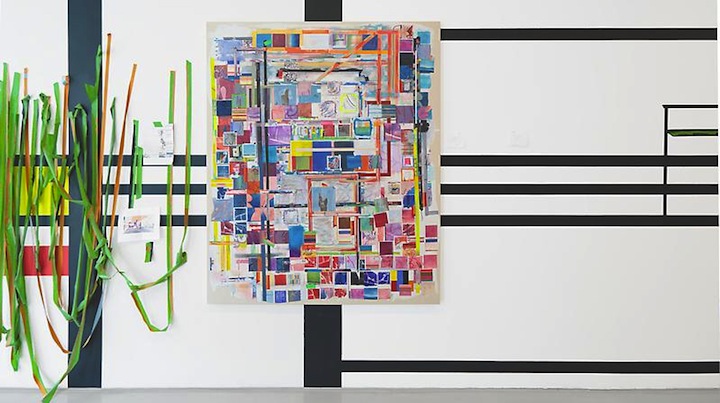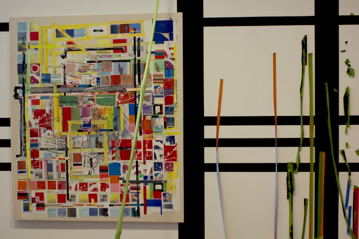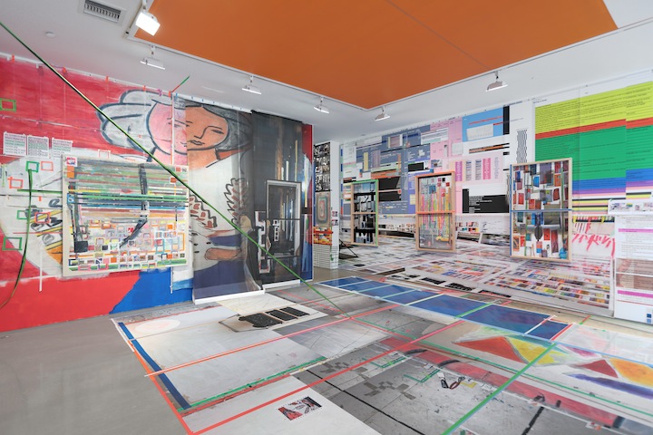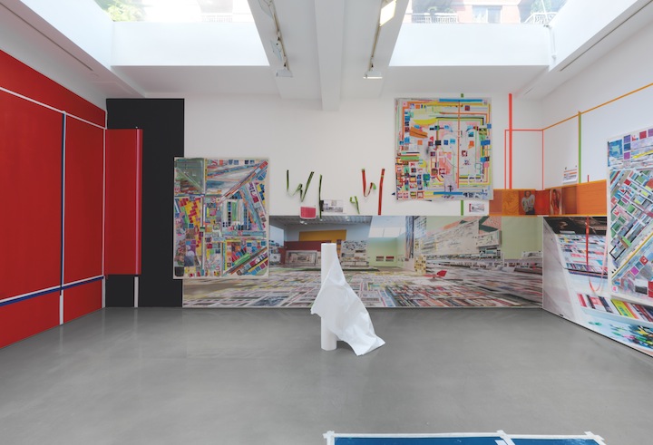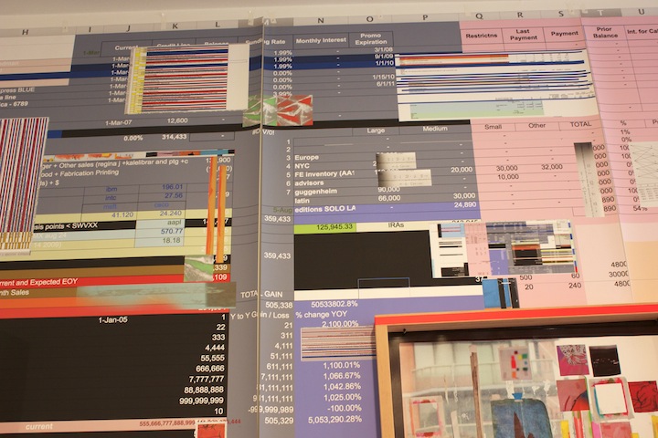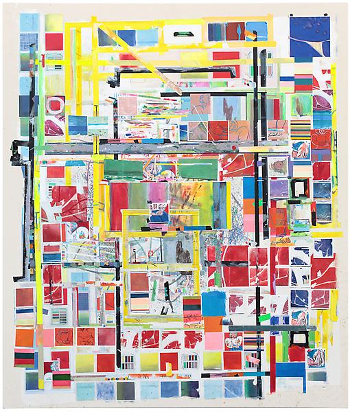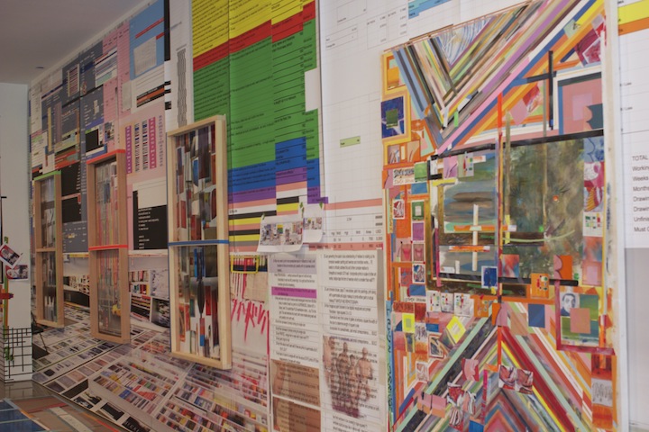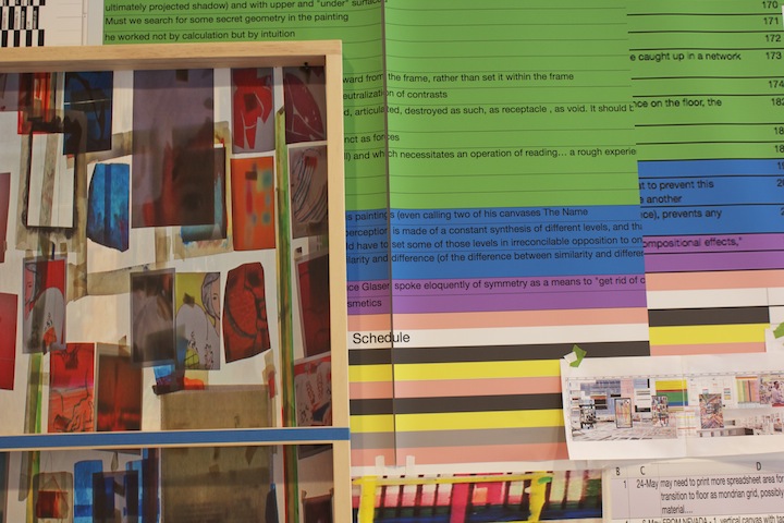 | paintingassupermodel - 1,500 sq ft, mixed media installation (solo exhibition), at Ameringer McEnery Yohe (New York, NY, 2014) NEW YORK, NEW YORK - AMERINGER | McENERY | YOHE is pleased to announce paintingassupermodel, the gallery's first solo exhibition with artist Franklin Evans. Evans presents a new installation comprised of wall painting/collages, eight large paintings, 1,500 square feet of digital prints on paper/canvas/silk, photographic sculptures, floor works, and sculpture vitrines that alter the architecture of the gallery. The exhibition will open on 5 June and will remain on view through 1 August 2014. A public reception for the artist will be held on 5 June from 6:00 to 8:00 PM. Evans alludes to Yve-Alain Bois' 1993 book Painting as Model, using parts of Bois' essays on Mattise, Mondrian, and Newman within the context of his current studio investigations. In addition to the aforementioned artists, these investigations include: Young, Irwin, Giselle, Blue Nude, Romanian Blouse, brian, grid, The Dance, Boogie-Woogie, paint chips, 3-year old, scarface, trompe l'oeil, Halvorson, Guyton, X, Pollock, de Kooning, process, von Heyl, digital recapturing, Dilg, Dupuis, Baltz, Westide Piers, Basel Miami, spine, hands, butt, back, drag, lips, pink, facepaint, arm, wing, flight, floor, primary, secondary, tertiary, derivatives, double negative, Henri, text, arch drawing, energy, field, Weatherford, Jacobs, assistant, fabrication, Kanter, Sololab, DiOrio, Luque, rhizome, measure, clarity, unstretched, object, eyes, smile, orange, Irwin Orange, New York, divisionism, window, wall, photo, Noland, model, financial modeling, Vir Heroicus Sublimus, supermodel, drag queen, markets, belief, Mike Kelley, order, failure, and spreadsheets. Evans' practice is a network, in constant flux, in absorption of adjacent content, in defocused experience of the contemporary, in rhizomic replication, and in reference to itself. The work occupies the field of painting/installation with studio process and sit as its subject. His work flips between digital and material, process and object, thought and action, and the present and memory. Evans uses art history (often painting history) as a significant input to his practice, and investigations of specific artists become content and media within his unfolding worlds. His interest and self-narrated alignment of his practice to Matisse, Mondrian, and Newman made Bois' three essays on these artists in Painting as Model a focus for Evans. Evans sifts his reading of Bois for content related to his own practice. His work does not illustrate Bois' thought, but rather Evans uses Bois' text become components of Evans' installations. These installations offer synaptic experience of art, the heroic, the functional, and camp. CURRENTLY BEING UPDATED ----- Link to Ameringer McEnery Yohe paintingassupermodel, 2014 Link to Hyperallergic Review, Patrick Neal Link to Artcritical Review, Matthew Farina Link to ArtInfo Daily Pic, Blake Gopnik |