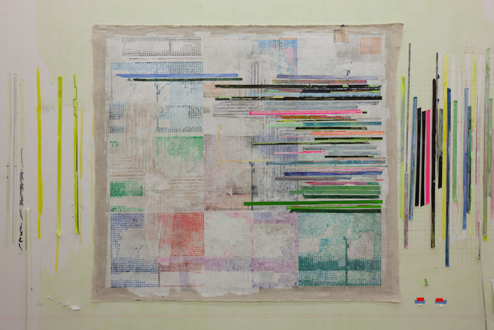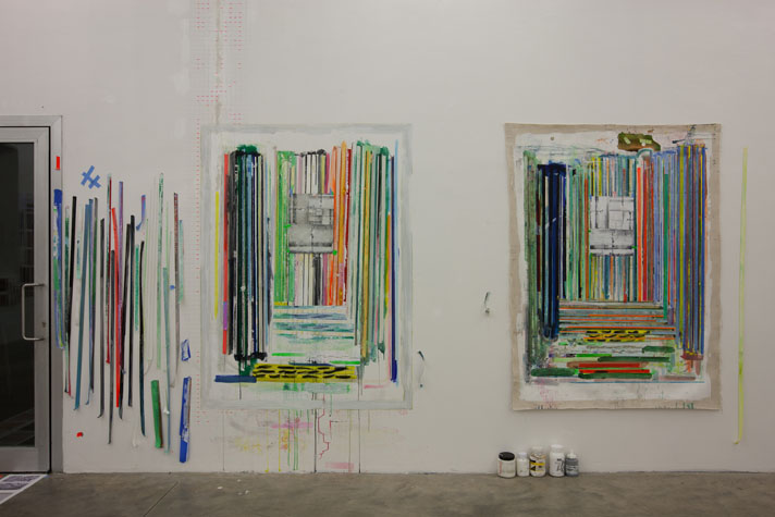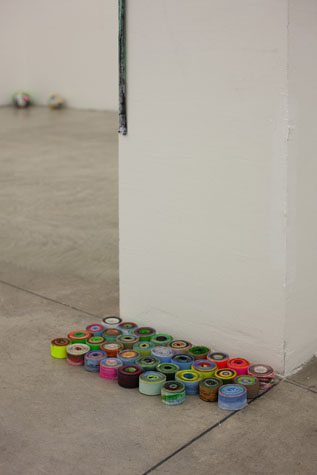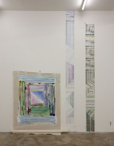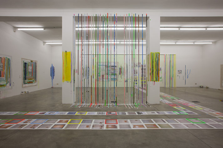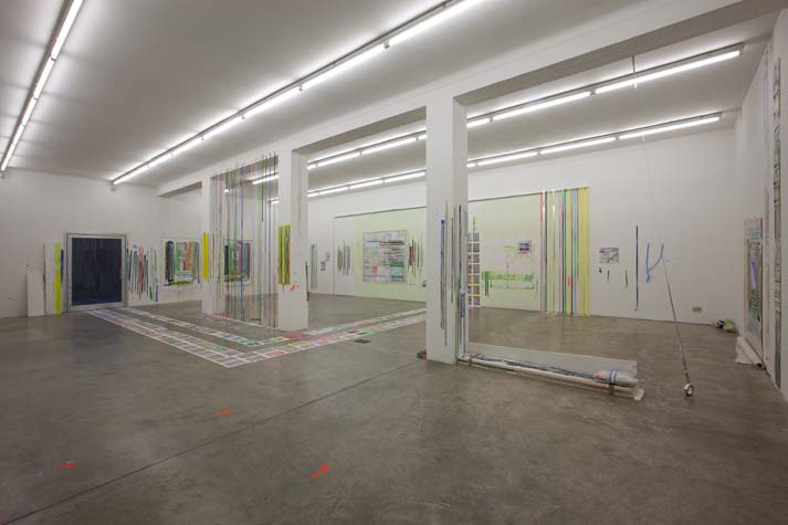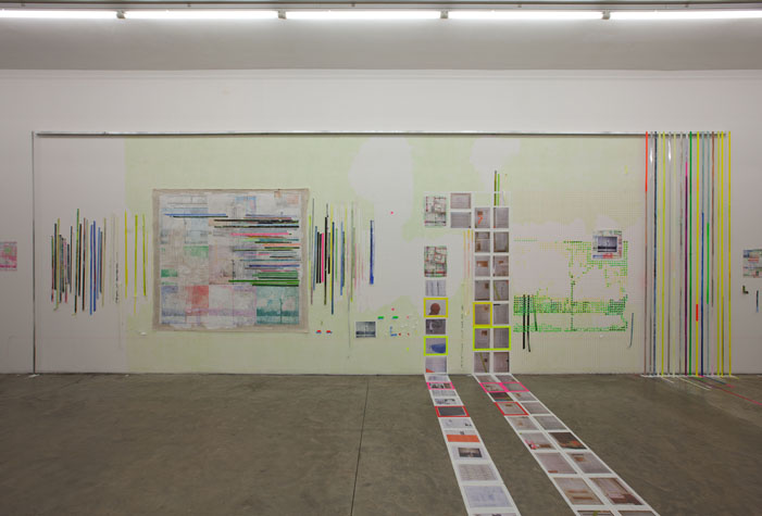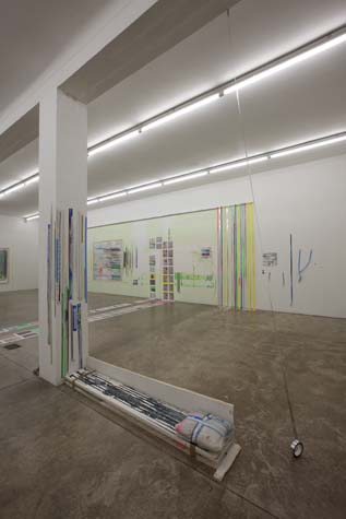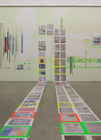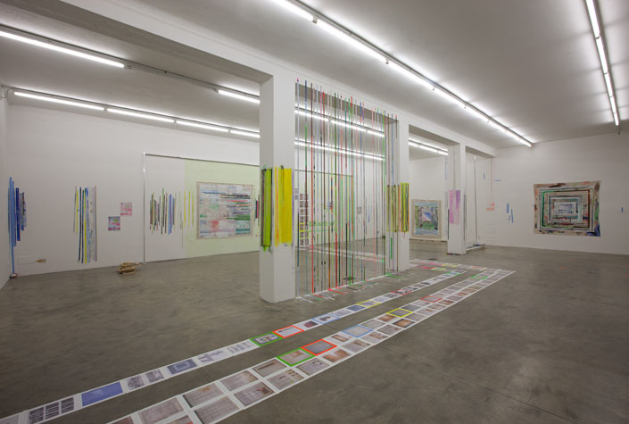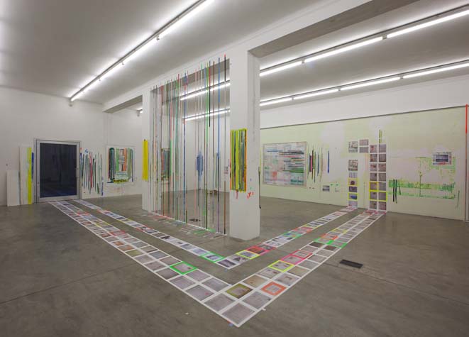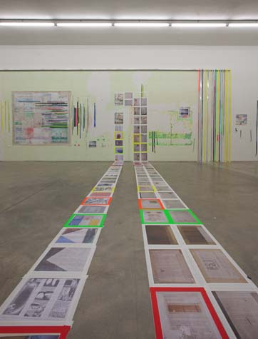 | times2 - 1,800 sq ft, mixed media installation (solo exhibition), at Federeico Luger (Milan, Italy, 2010) Mixed media installation featuring pairs of works in which each part of the pair offered a consideration of the other. The conceptual possibilities of temporal expansion and contraction were emphasized through the physical and temporal doublings. For example, textmindfloormind was a pair of types of laminated 9” x 11” digital prints adhered to the floor. The laminations contained the rephotographed press releases from Greater New York 2010 (MoMA PS1), timecompressionmachine (photographs were taken after three months of foot traffic and thus worn and torn). This rephotographing of the past extended the temporal, and the lamination of the new pairs alluded to ideas of the archival. One group of laminations included all the the photographs of the press releases with images cut from the press releases. The second group of laminations included all the images that were cut from each press release, printed to a new dimension of 9” x 11”, a significant increase over the original scale of the image. Other pairs in the installation included: 1. a painting of acrylic on canvas with a trompe l’oeil watercolor painted in the center and its pair, a wall painting at the same dimension with a physical watercolor on paper in the center, making a double image; 2. painted tape screens dividing the space and the same quantity of tape rolls unrolled and clustered on the floor; 3. 72” x 72” acrylic on canvas and 14” x 14” watercolor on paper of similar images but different media and scale. |