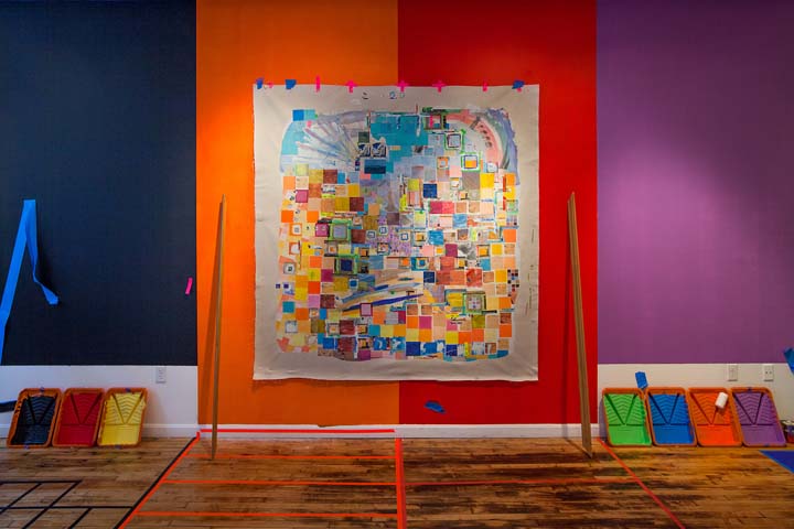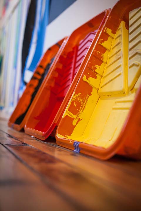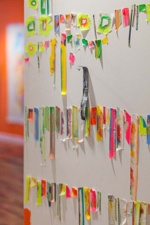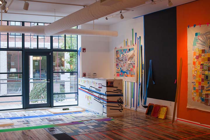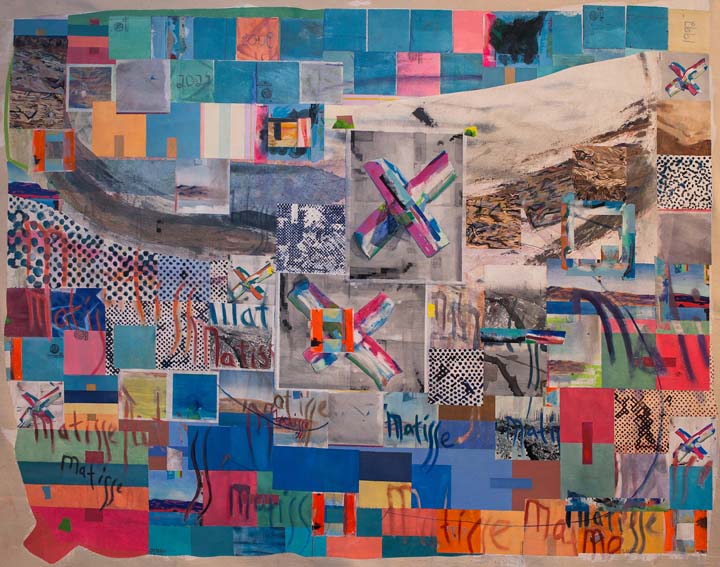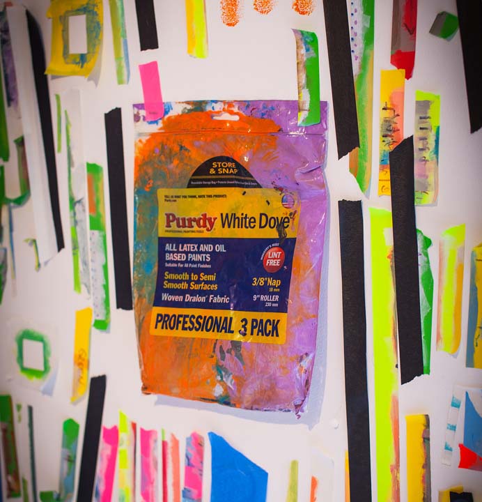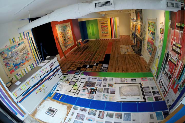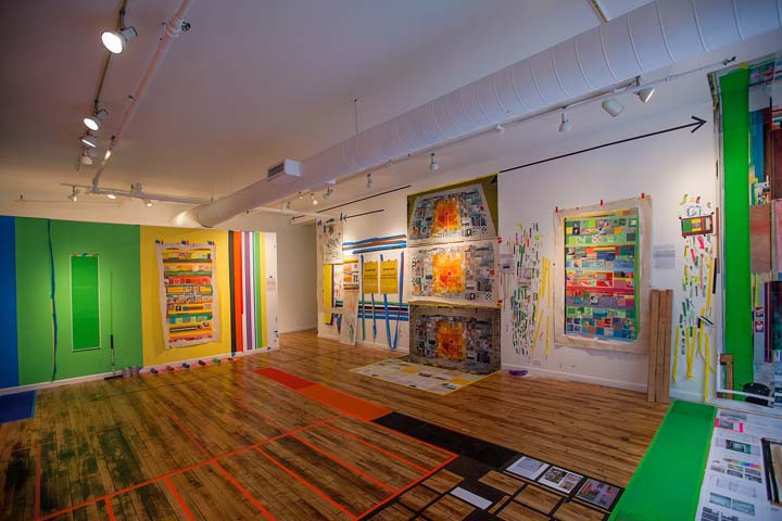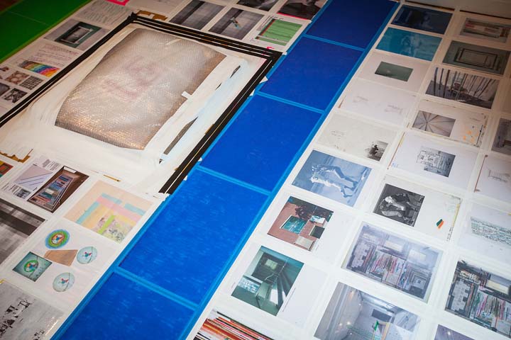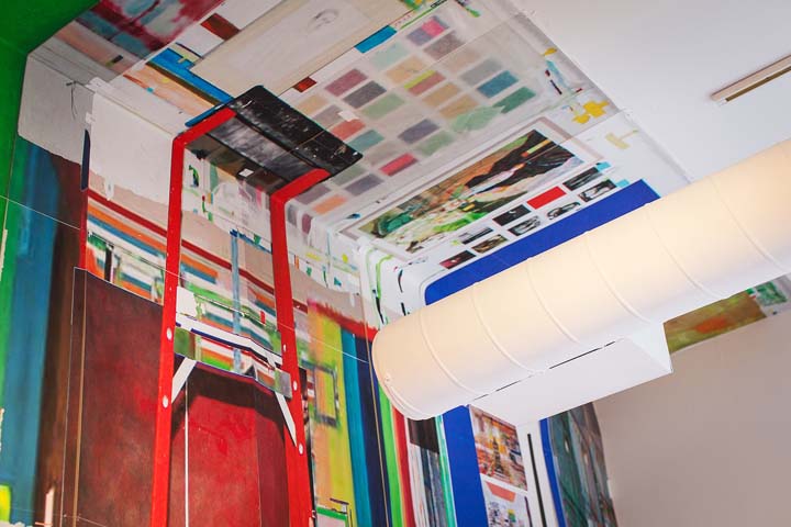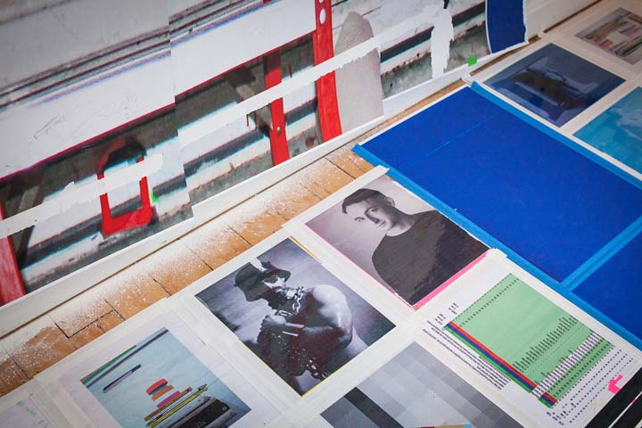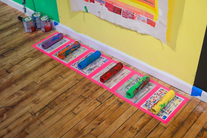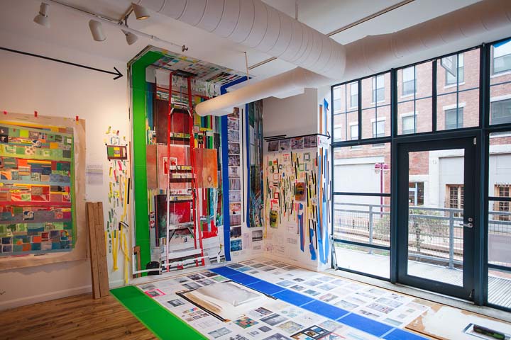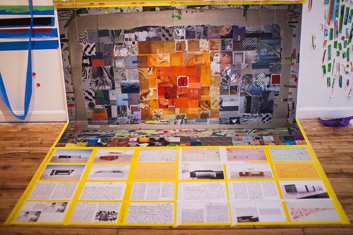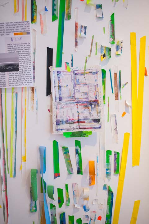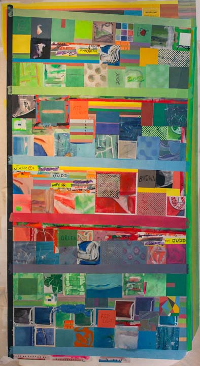 | juddpaintings - 800 sq ft, mixed media installation (solo exhibition), at Steven Zevitas Gallery(Boston, 2014) PRESS RELEASE: In juddpaintings, Evans presents a new installation comprised of wall painting, collage, paintings, digital prints, tape, process notes, and laminations. The exhibition presents the decomposition of his installation practice to the primary object subject of his practice: Painting. Upon entering the exhibition, the viewer passes through a threshold of a floor to ceiling installation of paint, images and process and into a gallery of walls painted bands of the color spectrum that dissolves to white. Paintings are hung on the walls and move from varying degrees of contextual mediation to an uninterrupted object on a white wall. Juddpaintings alludes to Evans' concurrent installation at Montserrat College of Art in Beverly, MA titled juddrules. For both projects, he uses parts of specific art reviews by Donald Judd to derive "rules" to inject into his environments and paintings. For example, a 1962 review of Morris Louis at Emmerich Gallery is pared down to, "... six equal bands. The yellow medium, yellow deep and red light bands make a progressive group, but the same red light, a green, a brown and another red light make a symmetrical group." Two paintings use this rule as starting points and as limitations that the color relationships establish in the repeated depiction of images. Evans' repetition of images parallels the density of images experienced in contemporary culture. He embraces the unstable ground of fluid refocus, obsession, and repurpose. In juddpaintings Evans' hand rearranges and repurposes: donald judd, 1959, morris louis, 1962, friedl dzubas, josef albers, roberta smith, henri matisse, san francisco, sigmar polke, manhunt, ox-bow, montserrat, ellen alfest, mel bochner, sarah charlesworth, jay defao, pyramid lake, davos, gerhard richter, lewis baltz, romanian blouse, 1975, bathers, david jacobs, paintingassupermodel, juddrules, lemon valley, 1967, stead, nevada, 1977, beverly, boston, martial raysse, trompe l'oeil. Link to Boston Globe review, Cate McQuaid , November 2014. Link to Art New England review, Robert Moeller , October 2014. |